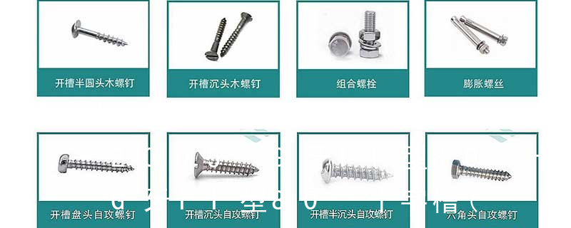 (鐵板牙自攻螺絲) B-2: Plastic Tapping Screw. (塑膠用,自攻螺絲) C: Wooden Screw : 木工螺絲 D: Drywall Screw :水泥墻螺絲 E: Self Drilling Screws鉆尾螺絲(不銹鋼鉆尾螺絲,復合材料鉆尾螺絲) F:膨脹螺絲,四片膨脹螺絲又