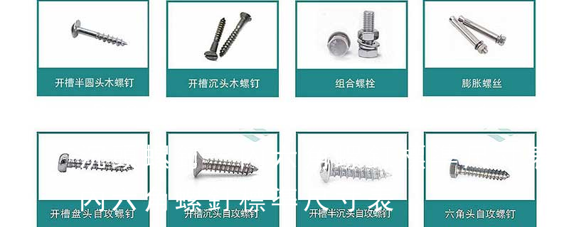 BS 4168《內六角螺釘和板手.米制系列》,我們國家的內六角螺釘和板手的標準是分開的:GB/T 70.1-2008 內六角圓柱頭螺釘 GB/T 70.2-2015 內六角平圓頭螺釘 GB/T 70.3-2008 內六角沉頭螺釘 GB/T 5356-2008 內六 螺栓有:1、方頭螺栓,2、半圓頭方頸螺栓,3、十字槽盤頭螺釘,4、內六角沉頭螺釘,5、方螺母C級,6、蝶形螺母,7、六角頭螺栓,8、十字槽盤頭自攻螺釘。大小有M18、M6、M8、M16、M10、M12、M14、M20等型號。通常用