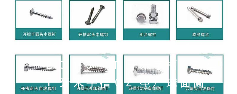 1.機螺釘 2.自攻螺釘 3.鉆尾螺釘 4.墻板釘 5.纖維板釘 6.木螺釘7.六角木螺釘 8.不脫出螺釘 9.組合螺釘 10.微型螺釘 11.家具螺釘 12.電子螺釘頭型:1.六角頭(hexagon head) 2.六角頭法蘭面(hexagon head with flange) 3.